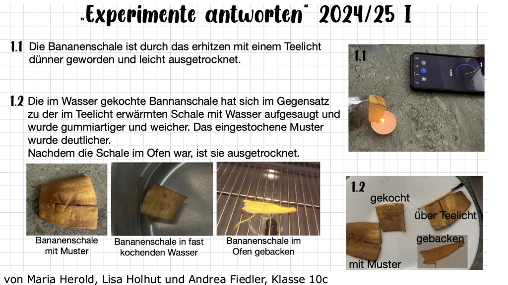 Die Schülerinnen und Schüler begannen ihre Experimente mit der Bananenschale: Ein Stück wurde für 30 Sekunden mit der Außenseite über die Flamme eines Teelichts gehalten, und die entstehenden Veränderungen wurden sorgfältig dokumentiert. Ein weiteres Stück der Schale wurde mit einem Muster versehen und anschließend für zwei Minuten in ein siedendes Wasserbad gelegt. Die Veränderungen an der Struktur der Schale wurden präzise erfasst.