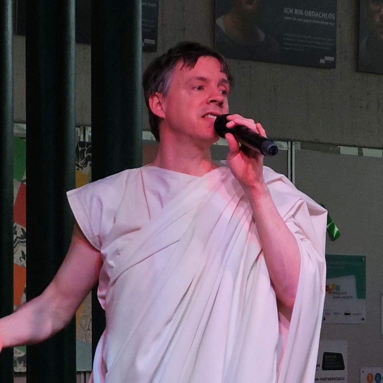 Am 3. Februar 2026 begeisterte der Kabarettist und Bühnenlateiner Björn Puscha mit seinem Schulprogramm „Schlechte Karten für Jupiter“ mit viel Witz, schauspielerischem Können und sprachlichem Geschick unsere Lateinschülerinnen und Lateinschüler (und solche, die es vielleicht noch werden wollen) von der 5. bis zur 9. Jahrgangsstufe. In zwei Auftritten nahm er sein Publikum mit auf eine Reise in die römische Antike, auf den Spuren ihrer Kultur und ihrer Sprache: Latein.