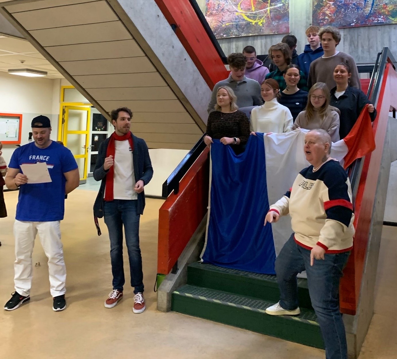 Ein besonderer Moment entstand, als Frau Michaela Kraus, Fachleiterin Französisch, gemeinsam mit ihrer 12. und ihrer 10. Klasse die Marseillaise anstimmte. Unterstützt wurde sie dabei von Frau Eva Al Affash, Mitarbeiterin in der Schulleitung und selbst Französischlehrerin und weiteren Kolleginnen und Kollegen, die mitsangen und so für einen sehr eindrucksvollen und gemeinschaftlichen Augenblick sorgten.