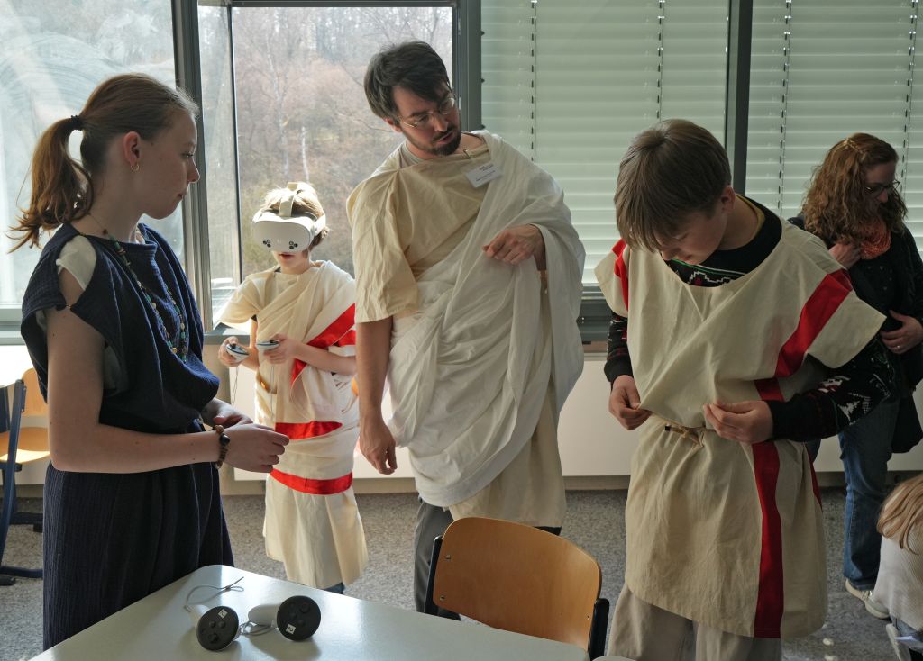 Mit Brille und Controller ging es dabei sogar auf eine virtuelle Zeitreise ins antike Rom. Das Kolosseum aus der Ich-Perspektive, Straßenlärm und Architektur – Geschichte wurde bei der Lernstation der Fachschaft Latein dank der VR-Brillen anschaulich, ohne den Klassenraum zu verlassen. Lehrkräfte erläuterten, wie solche Formate in Projekten und Unterrichtseinheiten eingebunden werden: nicht als Gimmick, sondern als didaktisch gezielter Zugang zu Themen.